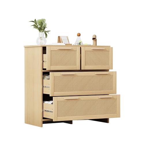 HAINEW Rotting byrå skänk med 4 rottinglådor, träskåp, förvaringsskåp med trähandtag för hall vardagsrum, 80 × 38 × 80 cm (natur)