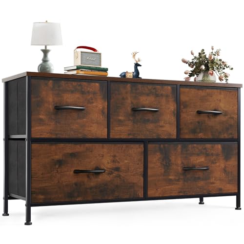 Byrå, skänk med 5 vikbara tyglådor, handtag, förvaringsskåp med tippskydd för vardagsrum, sovrum, brun
