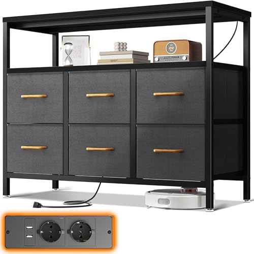 ODK Byrå, med 2 Eluttag och 2 USB-portar, 6 Stora Tyglådor, Multifunktionell Byrå Lämplig för Sovrum och Vardagsrum, 100 * 30 * 85,2 cm, Svart