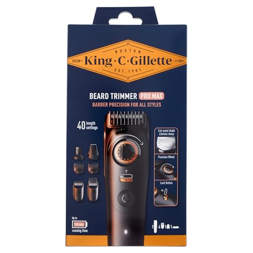 King C Gillette skäggtrimmer män PRO MAX, trådlös skäggtrimmer med 40 längdinställningar och stillås — inkl. 1 rengöringsborste, 4 utbytbara kamtillbehör och 1 laddningskabel — svart