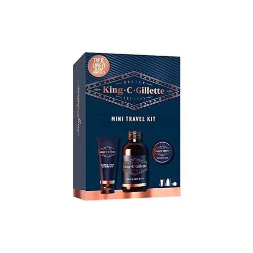 Gillette King C. Skägglåda för män, mini resekit essentiell ansiktsvård, fuktgivande vård för 3 dagars skägg, rengöring, kakaosmör balsam för att komplettera rakrutin