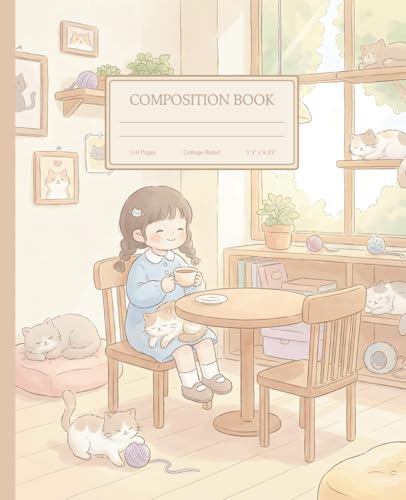 Cozy Cat Café Themed Composition Notebook | 9.25in x 7.5in | College Ruled | 110 Page Notebook: Cute Pastel Notebook for School, Journaling, and Creative Writing