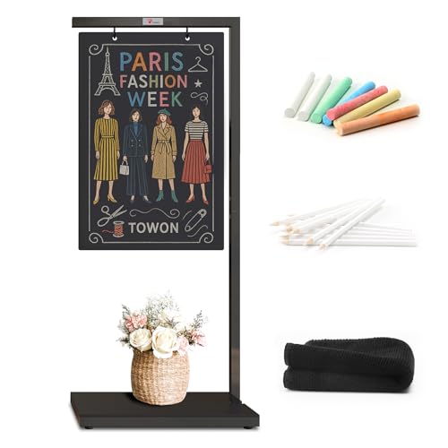 TOWON Stor golvstående tavla skylt med svart metallstaffli, hängande krita skylt utomhus med metallbas för café bar, bistro, blomsterhandlare eller bröllop, bärbar och dubbelsidig, 110 x 47 cm