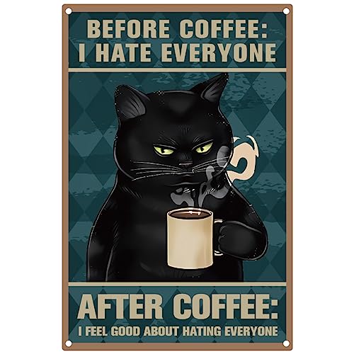CREATCABIN Svart katt kaffe metall tenn skyltar Before Coffee I Hate Everyone väggaffisch skylt rolig vintage konst hängande dekor för kaffebar hem badrum vardagsrum sovrum café bar gåvor 20 x 30 cm