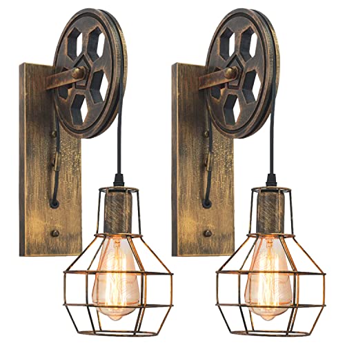 iDEGU 2 stycken industriella vägglampor, vintage-vägglampor i remskiva-design, retrolampa av metall och trä, hängande lampa, vägglampa för sovrum, vardagsrum, restaurang, café, bar, hall, brons