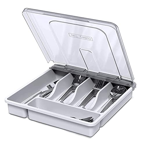 HIMAugbo Plast Besticklåda med Lock, Bestickbricka för Lådor med 5 Fack, Stor Storlek Fallresistent Bestick Förvaringslåda, Lämplig för Förvaring av Köksredskap eller Camping, 30 * 30 * 7cm,White
