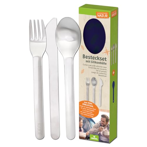 moses. Expedition natur bestick-set, 3 delar barnbestick med kniv, gaffel och sked av rostfritt stål, med praktiskt silikonfodral, perfekt för camping, resor, utomhus och skola