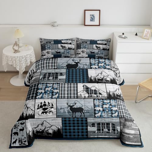 Loussiesd Rådjur älg björn varg dun täcke blå rutig rustik stuga täcke set gård skog camping jakt sängkläder set geometriskt rutigt påslakaninlägg/täcke set rumsdekor king size