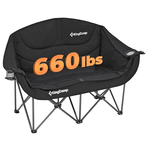 KingCamp Dubbel campingstol, fällbar, bekväm, vadderad, 2 sitsar, med mugghållare och armstöd, överdimensionerad fällbar trädgårdsstol för camping, picknick och fiske, svart
