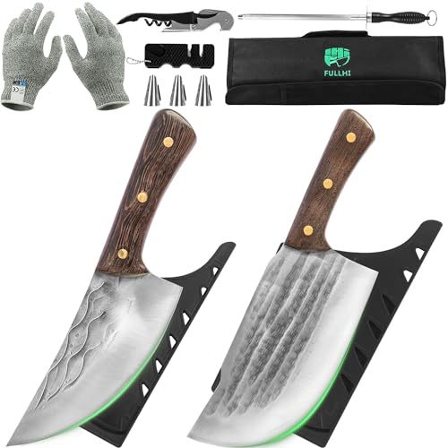 FULLHI Professionell 8-delad slaktarknivsats med knivväska handsmidd kockkniv urbening högkolstål köttyxa knivset för kök, camping, BBQ