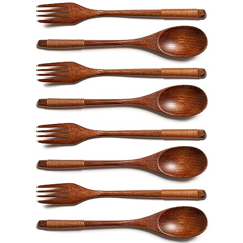 8 stycken träporslin, träsked, kökssked, träsked, trägafflar, gafflar, långt handtag för att skydda mot värme, till middag kök camping, brun