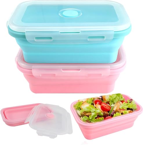 Tyafzzn Vikbara matförvaringslådor, 2 stycken vikbara matlådor med lock, 800 ml vikbar matlåda, vikbar burk silikon lämplig för camping picknick kontor kök (blå + rosa)