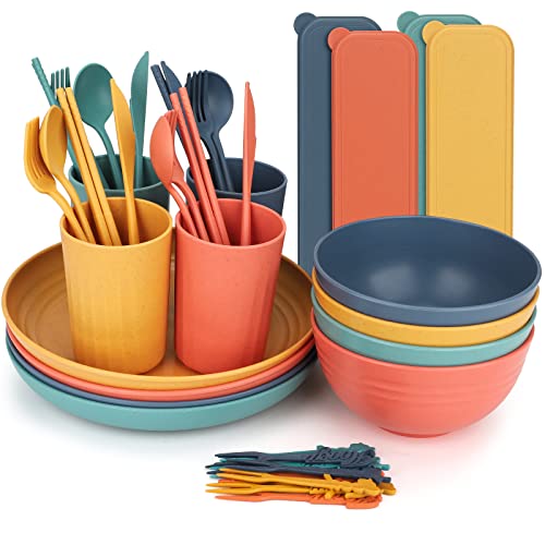 Odoland Lätta okrossbara bestickset för 4 personer, mikrovågsugns- och diskmaskinssäkra tallrikar skålar mugg-kit, återanvändbar servis med bestick, för camping, kök blå