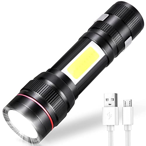 flintronic LED-ficklampa uppladdningsbar, 800 LM justerbart fokus, vattentät ficklampa med sidoljus, minilampor, COB-ljus, 3 lägen för camping, promenader, nödsituation, gåvor [inbyggt