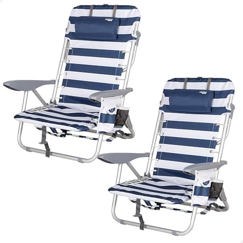 AKTIVE Förpackning med 2 hopfällbara stolar i flera lägen för strand, trädgård, terrass eller camping, marinera, 4 positioner, 50 x 45 x 76 cm, inklusive ficka, rullstopp, stöder 110 kg, bärhandtag