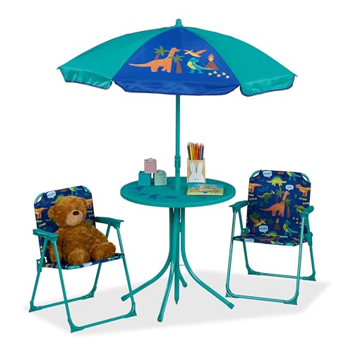 Relaxdays Camping barnstol grupp, dino-motiv, barnstol set med parasoll, fällbara stolar, bord, trädgård, turkos
