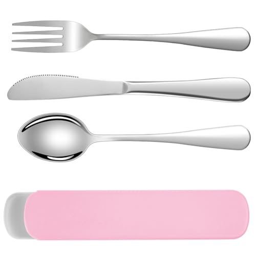 HOTUT rostfritt stål campingbestick för resor, 3 st kniv gaffel sked resebestick, Camping bestickset med låda, bärbart bestickset i rostfritt stål, för vandring, resor, picknick, kontor, skola (rosa)