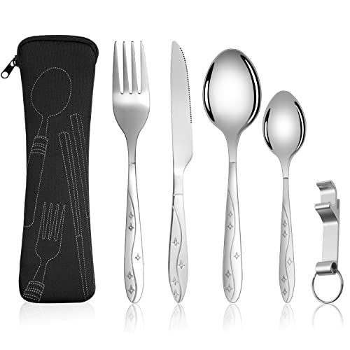 Vicloon bestickset i rostfritt stål, 6 stycken campingbestick med gaffel, sked, flasköppnare och bestickväska för resor, camping, picknick (svart stjärna)