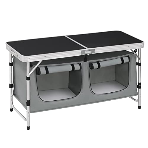 WOLTU Vikbart campingskåp, CPT8139szg, campingbord av aluminium i justerbar höjd med förvaringsutrymme, campingmöbel med bärväska, fällbord, trädgårdsbord för picknick och strand, svart + grå