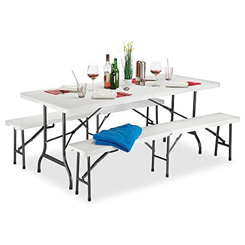 Brigros - Fällbart bord med trädgårdsbänkar, perfekt som campingbord eller picknickbord, hopfällbart platsbesparande bord med metall- och HDPE-utomhusbänkar (vit)