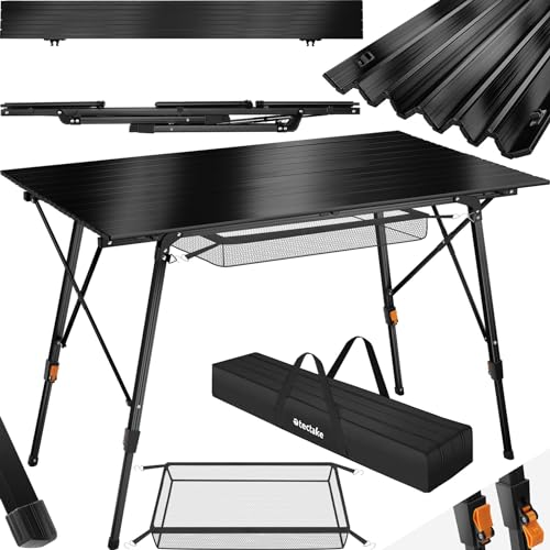 tectake® Campingbord Hopfällbart, Campingbord Aluminium, Justerbara Ben, Väderbeständigt, Strandbord Lätt, Inklusive Förvaringsnät och Bärpåse - Svart