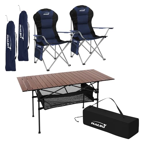 Hauki campingmöbel set 3 st. campingbord hopfällbart brunt med 2 campingstolar blå, camping set för 2 personer med bärväska, hopfällbart aluminiumbord med 2 fiskestolar, sittgrupp trädgårdsmöbler