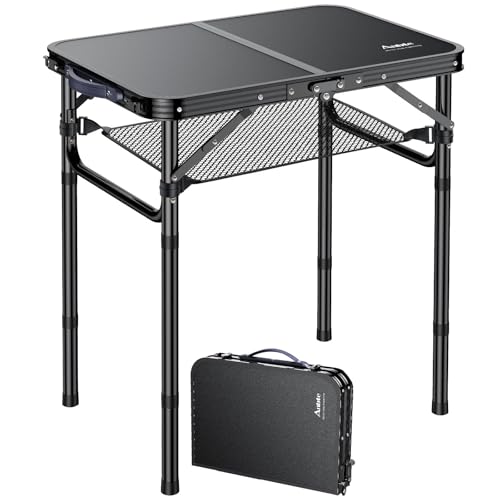 Anbte Hopfällbart Campingbord 60 x 40 x 23/46/70 cm, Justerbar Höjd Bärbara Aluminiumbord Vattentät Rutnätsversion Svart Lätt för Resor Matlagning BBQ Picknick