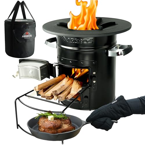 Arebos Raketugn inklusive gjutjärnspanna, bärväska och handskar | Dutch Oven BBQ | bärbart campingkök, vedugn | utomhuskök | Rocket Stove | Campinggrill svart