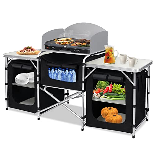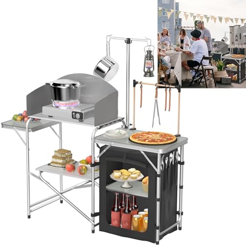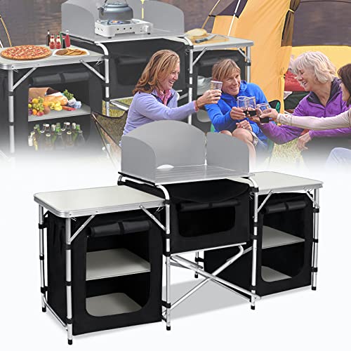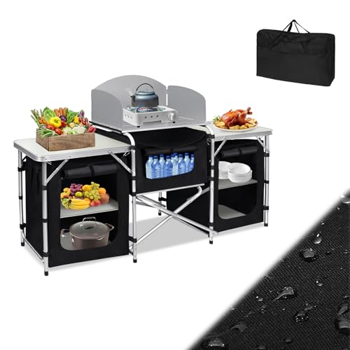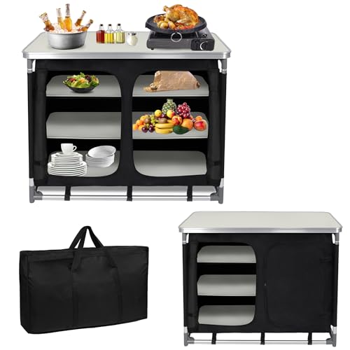 LARS360 Campingkök, vikbart campingskåp med aluminiumram, förvaringsfack, bordsskiva, inkl. bärväska, för picknick utomhus, camping utomhus, fest (5 fack och 3 bord)