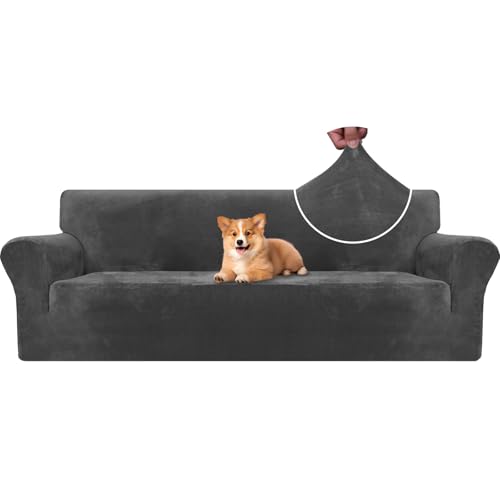 CYCMACO Housse De Canapé Velours 4 Places, Housse Canapé Extensible Avec Accoudoirs, Universelle Housse Canape Moderne, Housse Canapé Anti Poils Animaux, Sofa Cover Antidérapante, Gris