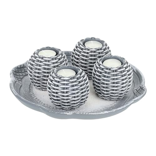 Relaxdays ljusdekoration, set med dekorativ bricka, 4 värmeljushållare och sand, bordsdekoration vardagsrum, dekorativa värmeljus, grå/vit