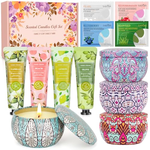 Presentset för kvinnor, alla hjärtans dag, födelsedag, alla hjärtans dag, mors dag, 4 handkräm & 4 doftljus och 4 ögonlapp, för dam, fru, mormor, moster