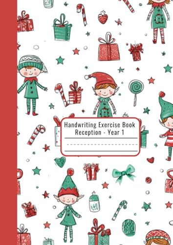 KS1 Writing Book for Reception & Year 1 - Autumn Term Cheerful Christmas Elves Exercise Book - Elves, Gifts & Candy Cane Design - Dotted Midline Handwriting Practice - Kids Learn to Write Book