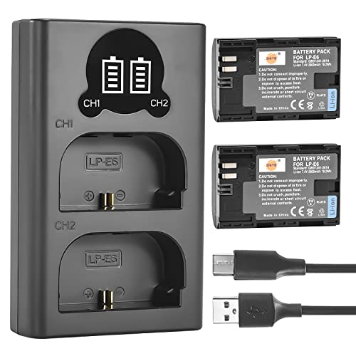 DSTE 2PCS LP-E6 LP-E6N (2600mAh/7.4V) batteriladdarset kompatibel med Canon EOS R, 5D Mark II, 5D Mark III, 6D, 7D, 60D, 60Da, 70D, 80D, XC10, XC15