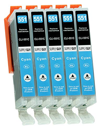 Supply Guy 5 bläckpatroner met chip kompatibel med Canon CLI-551 Cyan för IP7250 IP8750 IX6850 MG5450 MG5550 MG5650 MG5655 MG6350 MG6450 MG6650 MG7150 MG7550 MX725 MX925