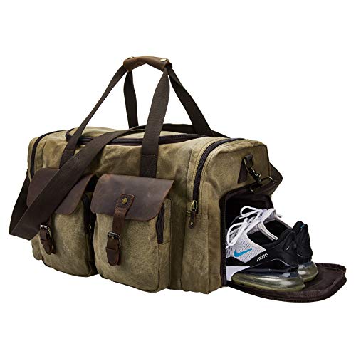 BRASS TACKS Leathercraft Men's Waxed Canvas Vintage Overnight Duffel Weekend Bag with Shoes Compartment (Khaki)