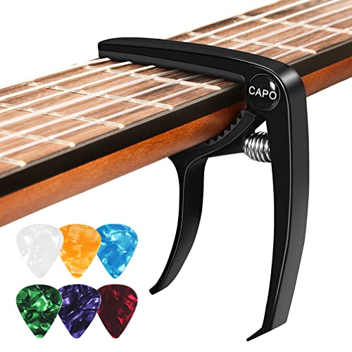 Aomig Kapodaster för gitarr Capo med 6 plektrum stämapparat gitarr gitarrtillbehör Capotastos Capodaster gitarrkapodaster för alla instrument, elgitarr, bas, violin, ukulele (svart)