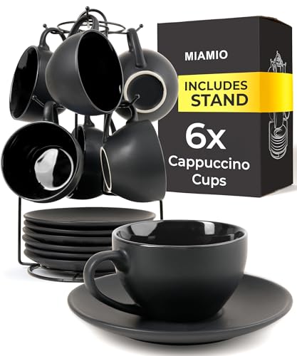 HEMDEKOR Cappuccinokoppar i keramik set med 4, 220 ml stapelbara cappuccino-muggar och fat med metallstativ för kaffeälskare, cappuccino, latte, american och te – svart och vit