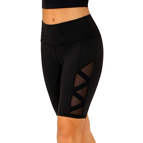 romansong dam nätleggings yogabyxor med ficka, inte genomskinliga, capri-hög midja magkontroll 4-vägs stretch, Svarta shorts, XS