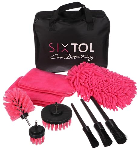 SIXTOL CAR DETAILING PINK 9 | Multifunktionellt rengörings- och tvättset för bilar | 9 delar | interiör och exteriör | nylonborstar | tvätthandske | mikrofiber | borrborstar | bärväska