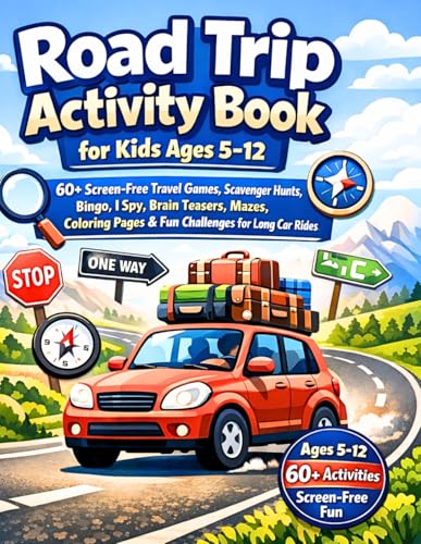 Road Trip Activity Book for Kids Ages 5–12: 60+ Screen-Free Travel Games, Scavenger Hunts, Bingo, I Spy, Brain Teasers, Mazes, Coloring Pages & Fun Challenges for Long Car Rides