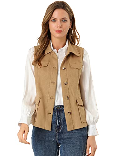 Allegra K Women's Faux Suede Vest Utility Buttoned Sleeveless Jacket with Cargo Pocket Large Khaki