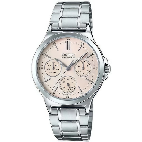 Damsklocka Casio LTP-V300D-4A med rosa urtavla och silverfärgad boett och armband i presentförpackning