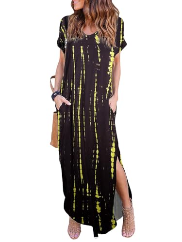 HUSKARY Women's Summer Tie Dye Black Maxi Dress with Pockets Casual Loose Short Sleeve Split Dresses