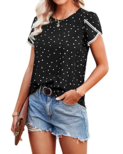 PRETTYGARDEN Women’s Shirts Summer Casual Crewneck Lace Crochet Short Sleeve Blouses Cute Floral Print Loose Tunic Tops (Small, Heart White Black)