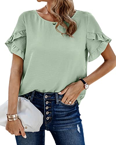 PRETTYGARDEN Women's Shirts Summer Casual Crewneck Lace Crochet Short Sleeve Blouses Cute Floral Print Loose Tunic Tops(Solid Light Green,Large)