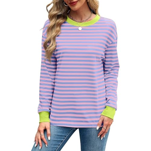 Womens Running Tee Shirts Slim Fit Striped Color Block Tops Loose Round Neck Long Sleeve Top Streetwear Cotton Blends Casual Blouse(Pink Blue,M)