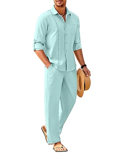 COOFANDY Mens 2 Piece Linen Outfit Button Down Shirt and Loose Pants Set Casual Beach Sets for Vacation