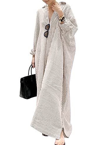 utcoco Womens Striped Long Sleeve Dress Casual Loose Button Down Cotton Maxi Shirt Dress (Small, Khaki)