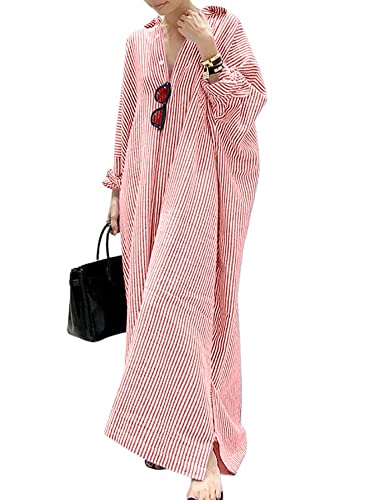 utcoco Womens Striped Long Sleeve Dress Casual Loose Button Down Cotton Maxi Shirt Dress (XX-Large, Red)